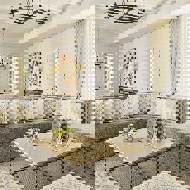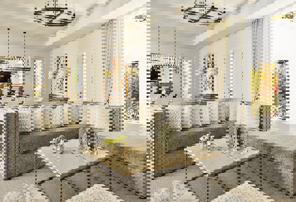 - Lounge with dining area and sofas looking out onto the beach